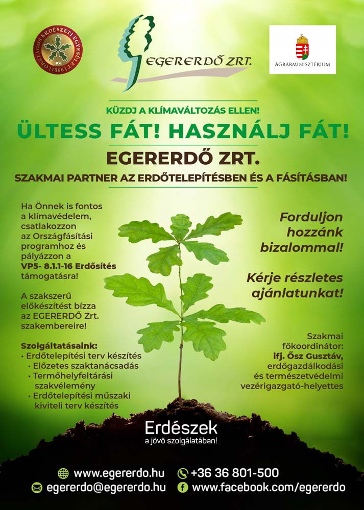 Az önkormányzati, magán és közösségi tulajdonban lévő alacsonyabb termőképességű területek ideális helyszínt jelentenének új erdő vagy fásítás létesítésére, melyet most pályázati forrásból (VP5- 8.1.1-16 Erdősítés támogatása) is megvalósíthat a tulajdonos! A pályázati dokumentációhoz szükséges tervezési feladatokban szakmai segítségre számíthatnak a gazdák, földtulajdonosok az EGERERDŐ Zrt.-től, termőhely feltárási szakvélemény, fafaj választás, szükség esetén engedélyeztetés, teljes körű pályázati dokumentáció elkészítésében. Szakmai főkoordinátor: ifj. Ősz Gusztáv erdőgazdálkodási és természetvédelmi vezérigazgató-helyettes. Keressenek minket bizalommal! Tegyünk együtt a klímaváltozás ellen! Forrás: Egererdő Zrt.