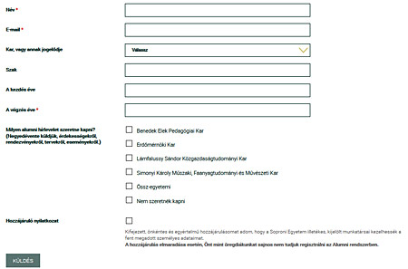 Amire pedig lényeges, az a Regisztráció, tehát hogy minél több soproni öregdiák regisztráljon ezen a helyen. Név, e-cím, kar és szak, kezdés és végzés éve, illetve hogy mely szakterület hírlevelét szeretné kapni, aki regisztrál, meg persze hozzájáruló nyilatkozat. Ezeket kell, illetve lehet megadni.