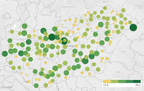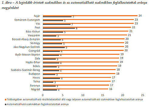 A megyei szintű adatok szerint az azon szakmákban foglalkoztatottak aránya, amelyek részfeladatainak nagy része vagy egésze automatizálható, Fejér megyében a legmagasabb: 24%. Ezt Komárom-Esztergom és Vas megye követi, ahol a foglalkoztatottak 23-23%-a dolgozott 2018-ban ilyen szakmákban. A megfelelő arányok Pest megyében 22%, Bács-Kiskun megyében 21% és Veszprém megyében szintén 21%. A leginkább érintett szakmákban foglalkoztatottak aránya Nógrád (16%), Baranya (17%), Tolna (17%) és Heves (17%) megyében a legalacsonyabb, Budapesten pedig 18% az arány.