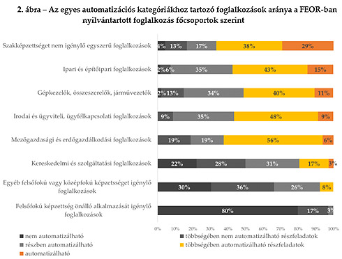A magyarországi szakmák többsége elemzésünk szerint a nem automatizálható kategóriába tartozik: a FEOR nyilvántartásban 122 olyan szakma szerepel, amelynek a részfeladatai nem automatizálhatóak. 79 szakma esetében a feladatok egy része már automatizálható, nagyobb részük azonban nem. 93 foglalkozás részben automatizálható, ezen szakmák részfeladatai között nagyjából egyenlő arányban szerepelnek automatizálható és nem automatizálható feladatok. 90 szakma esetében a részfeladatok többsége automatizálható, 26 szakma esetében pedig a jegyzékben felsorolt részfeladatok közül az összes vagy szinte az összes automatizálható. Utóbbi két kategória foglalkozásai tekinthetőek az automatizáció hatásai szempontjából leginkább érintetteknek.