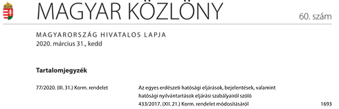 A 2020. március 31-i 60. számú Magyar Közlönyben jelent meg a 77/2020. (III. 31.) Korm. rendelet az egyes erdészeti hatósági eljárások, bejelentések, valamint hatósági nyilvántartások eljárási szabályairól szóló 433/2017. (XII. 21.) Korm. rendelet módosításáról