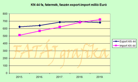 A KN 44-es termékosztály külforgalma tehát 2017-ben és előtte aktív volt, az export értéke meghaladta az importét, 2018-ra ez kiegyenlítettre változott, majd 2019-re passzív lett, a import az export fölé nőtt milliárd Ft-ban mérve.