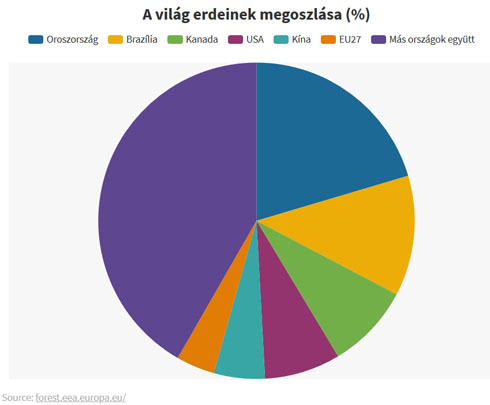 A 3,9 milliárd hektárból a legnagyobb arányban Oroszországban találhatók erdők, a világ erdeinek 20,4 százaléka. Brazíliában van az erdők 12,3 százaléka, Kanadában pedig 8,68 százaléka. Ha az EU-t kezeljük egy egységként, akkor a 27 uniós tagállam ezen a listán a 6. helyet foglalja el, 3,95 százalékkal. Ez 157 millió hektárt jelent, ami az EU27-ek területének 38 százaléka. Ami az unió egész területének megoszlását illeti, 44,7 százalék mezőgazdasági hasznosítású. A mesterségesen beépített terület egyébként 4,83 százalék. Az európai erdők nagy része magántulajdonban (az erdőterület kb. 60 százaléka), nem pedig állami tulajdonban van (40 százalék).