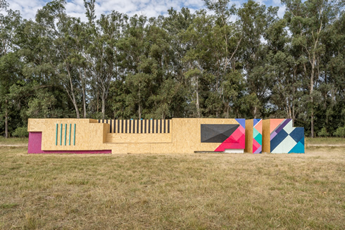 A "benching" kifejezés eredetileg azt jelenti, hogy a vasútállomáson egy padon ülve az elhaladó vonatok oldalára festett graffitiket vizsgáljuk. A Hello Wood Argentina táborban megszületett projekt célja, hogy társas helyzeteket hozzon létre: a padra le lehet ülni egyedül is, magas falakkal elszigetelve a többiektől, de akár párban vagy csoportban is használatba vehető.