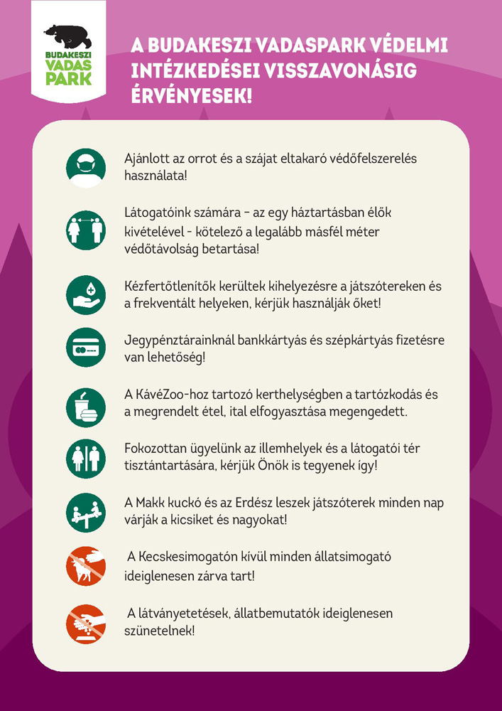 - A látogatók számára - az egy háztartásban élők kivételével - kötelező a legalább másfél méteres védőtávolság betartása. - Ajánlott az orrot és a szájat eltakaró védőmaszk használata. - A pénztárnál javasolt a készpénzmentes fizetési móddal (bankkártyával, SZÉP-kártyával) történő jegyváltás. - A Vadaspark területén a frekventált pontokon és a játszótereken kézfertőtlenítőket helyeztek ki a látogatók számára. - Az állatbemutatók és látványetetések ideiglenesen szünetelnek, az állatsimogatók (a Kecskesimogató kivételével) zárva tartanak. - A Vadaspark különös gondot fordít az illemhelyek és a látogatói tér tisztán tartására, egyben arra kéri a látogatókat, fokozottan ügyeljenek e helyiségek, terek tisztaságára.