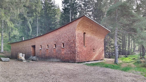 Két világ találkozik itt. Egyik a képeslapokról ismert Svájc. A közeli völgyet, melyben az Alsó-Rajna és Hátsó-Rajna Rajnává egyesül, mogorva, sziklás hegyoldalak veszik körül hófedte csúcsokkal, végeláthatatlan fenyvesekkel és a legelőkön békésen kérődző tehenekkel. Ennek feszül ellen a Rajnára rátelepedő vízerőmű, a legelő felett húzódó villanyvezetékek, a közeli vegyiüzem kéményei és a hegyoldalban sebként tátongó kőbánya. Ettől a bányától egy réten át az erdőhöz közelítve először mintha egy hajóorr sejlene fel a fák között, közelebb érve egy fabárka kontúrja rajzolódik ki, mely méltóságteljesen lebeg a fenyők tengerén. A bejárat is egy hajó ajtaját idézi: a négy lépcsőfokot mintha csak a beszállás idejére eresztették volna le a mély, de a szükségesnél semmivel sem szélesebb vagy magasabb nyílásból. Nem kevésbé izgalmas az épület erdő felőli feltárása sem, az ösvény fölé fél boltozatként magasodó homlokzatot a másik oldal fái egészítik ki, bekeretezve és kijelölve a megérkezés irányát.