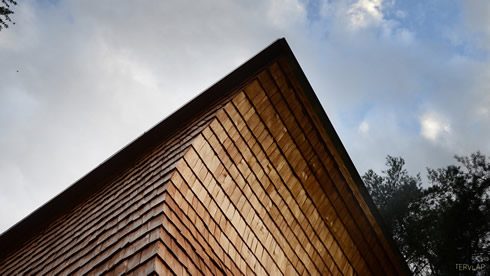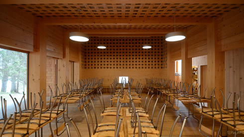Az építéshez felhasznált jegenyefenyőket a helyszíntől néhány kilométerre, 1400 m magasságban vágták ki kevéssel a decemberi újhold előtt, mivel az ilyenkor gyűjtött faanyagnak kedvezőbb tulajdonságokat tulajdonítanak. A homlokzatokon a kézzel hasított vörösfenyő zsindely finoman követi a falak és a tető ívét, sorai a hosszoldalakon a tető emelkedésével arányosan tágulnak. A terem kellemes akusztikájáról összefont vékony falemezekkel rögzített látszó gyapjú álmennyezet gondoskodik. Forrás: TervLap
