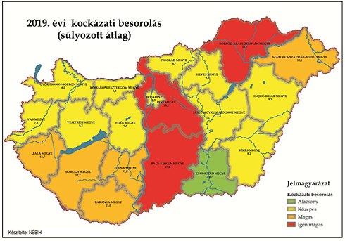 A kockázati tényezők összességét tekintve, a 2018. évihez viszonyítva szerény, de biztos javulás mutatkozott 2019-ben. Területi bontásban ez azt jelenti, hogy a kockázati besorolás alapján 2017-2019 között Békés és Jász-Nagykun-Szolnok megyében kis mértékben, de folyamatosan javult, míg Bács-Kiskun, Pest, Veszprém és Zala megyében kis mértékben, de folyamatosan romlott a helyzet. Az aktuális kockázati besorolás alapján 2019-ben Borsod-Abaúj-Zemplén megye mellett Bács-Kiskun és Pest megye is az "igen magas" kockázatú megyék közé került, viszont Baranya, Csongrád, Fejér és Hajdú-Bihar megye besorolása javult egy kategóriát.