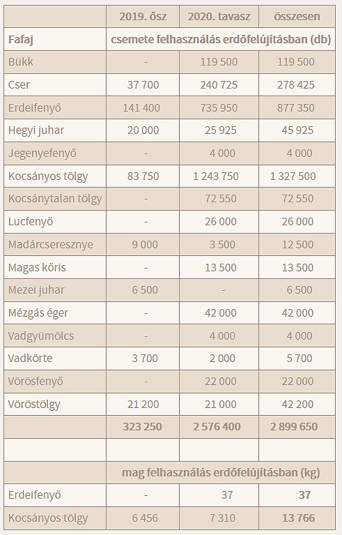 A 2019. ősz/2020. tavaszi erdősítési időszakban erdőfelújításainkban - az alábbi táblázatnak megfelelően - 2.899.650 db csemetét, 37 kg erdeifenyő magot és 13.766 kg kocsányos tölgy makkot ültettünk, illetve vetettünk el.