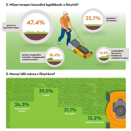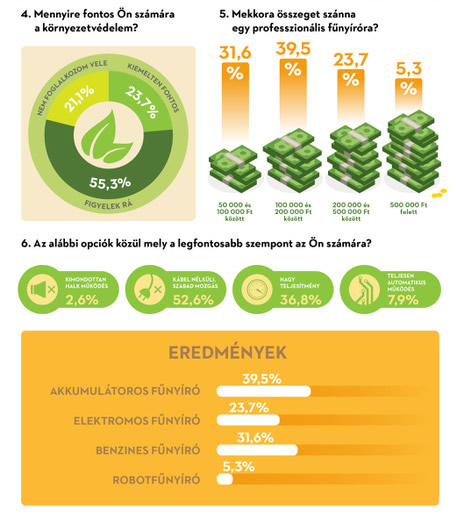 A vállalat Facebook oldalán közzétett kérdéssor egyaránt kitért a használat alá vont terület méretére, annak terepviszonyaira, valamint az eszközök kényelmi funkcióira is amellett, hogy vizsgálta a fogyasztók ár-preferenciáit. A kapott eredmények rámutatnak arra, hogy a válaszadók közel fele egyenetlen, gyomos talajon használja fűnyírógépét és a kerti munkára heti egy-két óránál többet nem szeretnének szánni. A válaszadók közel 80 százalékának fontos a környezetvédelem, 25 százalékuk pedig kiemelten kezeli a fenntarthatóságot.