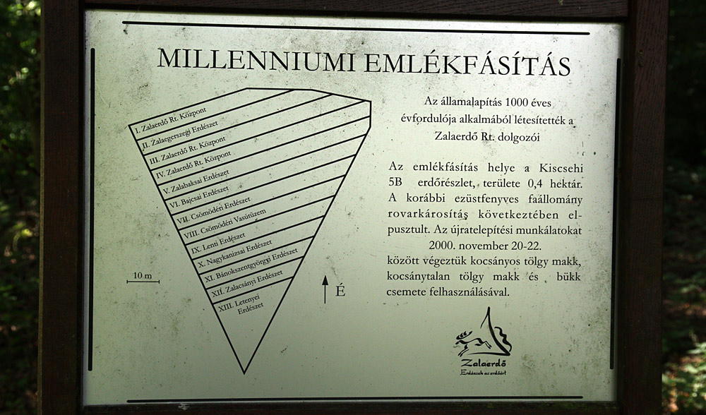 Aszúkéros lucos helyére a milleneum alkalmából ültetett fásítás emléktáblája, mely megmutatja melyik részt melyik erdészet készítette. Kocsányos tölgy makkot, kocsánytalan tölgy makkot és bükk csemetét használtak fel ehhez.