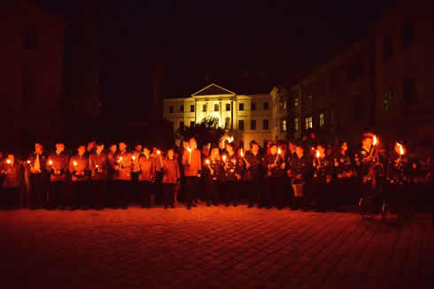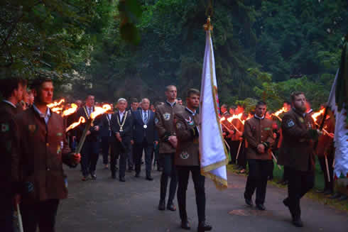 Az ünnepi beszédek után a díszmenet előtt kitárult az egyetem kapuja és a búcsúzást jelentő fáklyalánggal kísért szalamander elindult a soproni véndiákok hagyományos útján a Fő térre, ahol Farkas Ciprián polgármester köszöntötte őket. A polgármester beszédében kiemelte, a város és az egyetem sorsa elválaszthatatlanul összekapcsolódik egymással. Felidézte, hogy több mint száz évvel ezelőtt a Selmecbányáról menekülő egykori magyar királyi bányászati és erdészeti főiskola tanárai és diákjai előtt Sopron kitárta kapuit. Hozzátette, 2021 szintén jubileumi év lesz, hiszen száz esztendeje annak, hogy Sopron Magyarország része maradhatott és ebben a sorsfordító küzdelemben főszereplőként vettek részt az akadémisták.