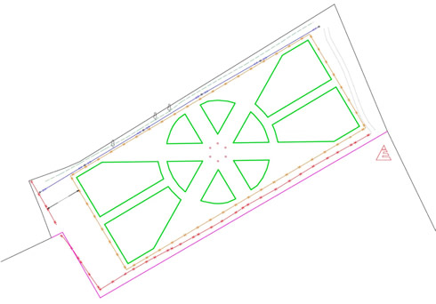 A mellékelt ábra az erdőtelepítés határvonalait ismerteti. A zöld kontúrok között ültettünk facsemetéket, a többi kaszált füves terület (jórészt nyiladék) lesz. A terület mellett elhaladó úton a diccei rakodó felől érkezve egymás után három, 12 méter széles nyiladékra lesz rálátásunk, amelyeket különböző fafajok szegélyeznek. Az első nyiladékon a tavasszal már lombban virágzó vadkörte, a távolban az ősszel szép sárga lombú korai juhar alkotja a szegélyt. A második nyiladékon elöl lila virágú magnóliák, hátul őszi aranysárga lombú tulipánfák vannak. A harmadik nyiladékon (visszafelé nézve) tavasszal virágzó, ősszel piros lombú cseresznye a szegély elöl, hátrébb az őszi bordó lombú vöröstölgy. A körszeletek külső szegélyén oldalt virágoskőris-tiszafa, illetve nyír-tiszafa sorok vannak, az út felé eső szegélyen pedig kékesszürke atlaszcédrusokat ültettünk, eléjük pedig ősszel kárminpirosra színeződő kecskerágó-cserjéket.