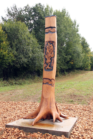 Az erdőtelepítést bekerítettük vadkárelhárító kerítéssel, és az egyik sarkához egy emléktáblát helyeztünk el, egy különleges oszlopon. Mivel az emlékerdő szegélyénél az erdei vasút pályája húzódik végig, ezért vasutasainkkal két tölgy vasúti talpfából síncsavarokkal összerögzített tartóoszlopot készíttettünk. Ennek ferdén levágott tetejére helyeztük el a táblát, amelynek szövege: "Ezt az egy hektárnyi Négyszögletű Kerek Emlékerdőt a ZALAERDŐ Zrt. telepítette a 2021-es, "Egy a Természettel" Vadászati és Természeti Világkiállítás jegyében, 2019 decemberében." Az Emlékerdő ünnepélyes átadóján Dr. Kovács Zoltán, a 2021. évi "Egy a Természettel" Vadászati és Természeti Világkiállítás lebonyolításáért felelős kormánybiztos, Cseresnyés Péter országgyűlési képviselő, a Mura Nemzeti Program miniszteri biztosa és Rosta Gyula vezérigazgató mondott ünnepi beszédet, majd leleplezték a Kárpáti Hunor által faragott Emlékoszlopot 2020. szeptember 25-én. Az ünnepség részeként ültették el az Emlékfa gyanánt szolgáló hárs csemetét.