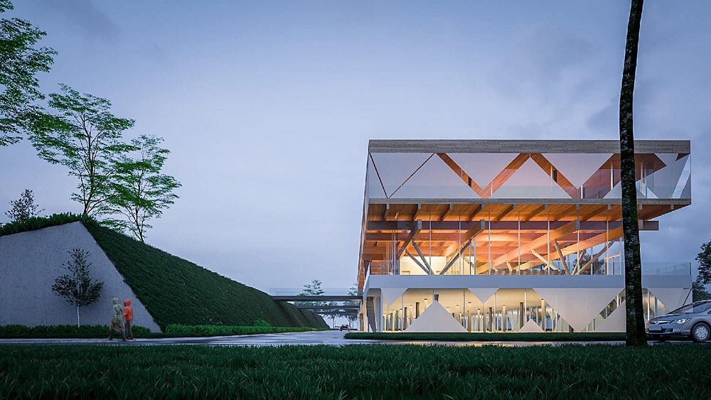 Az épületre úgy tekintettünk, mint egy megbízható és teherbíró polcrendszerre, amely képes rendet teremteni az információs és technológiai társadalom hálózatában. A tudás megosztásának csomópontja, amely a legkülönbözőbb emberek és cégek számára biztosít találkozási lehetőséget kutatásaik során. A szerteágazó és időben is változó funkciók igényeire egy hangsúlyozottan egyszerű, rugalmasan használható koncepcióval válaszoltunk. A funkciók három szinten rétegződnek egymás fölé, a megérkezés egy hídon keresztül az első emeletre történik, a telken található ligetes domboldalról.