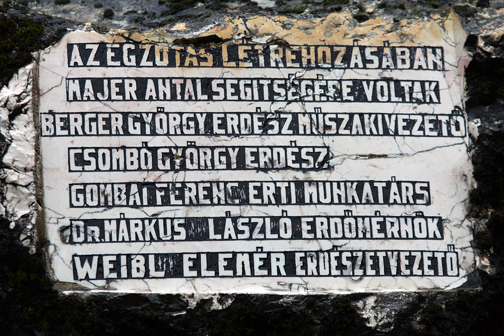 Varga László felolvasta a tábla közelében lévő emlékkő feliratát: Az egzótás létrehozásában Majer Antal segítségére voltak: Berger György erdész műszaki vezető, Csombó György erdész, Gombai Ferenc ERTI munkatárs, dr. Márkus László erdőmérnök és Weibl Elemér erdészetvezető. Rájuk is emlékezünk ma.