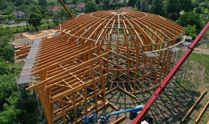 A magyarországi próba építkezés. A még nyitott szerkezet láttatni engedi, hogy a kör alaprajzú pavilon centrális eleme kupolás csarnok, körülötte pedig külső héj veszi majd körül az épületet.