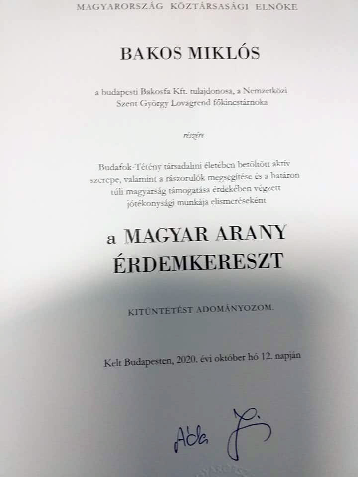 Az Alaptörvény 9. cikk (4) bekezdés f) pontja, illetve a Magyarország címerének és zászlajának használatáról, valamint állami kitüntetéseiről szóló 2011. évi CCII. törvény 18. § (1) bekezdése alapján - a miniszterelnök előterjesztésére - .... Budafok-Tétény társadalmi életében betöltött aktív szerepe, valamint a rászorulók megsegítése és a határon túli magyarság támogatása érdekében végzett jótékonysági munkája elismeréseként Bakos Miklós, a budapesti Bakosfa Kft. tulajdonosa, a Nemzetközi Szent György Lovagrend főkincstárnoka részére, .... MAGYAR ARANY ÉRDEMKERESZT polgári tagozata; .... kitüntetést adományozom.