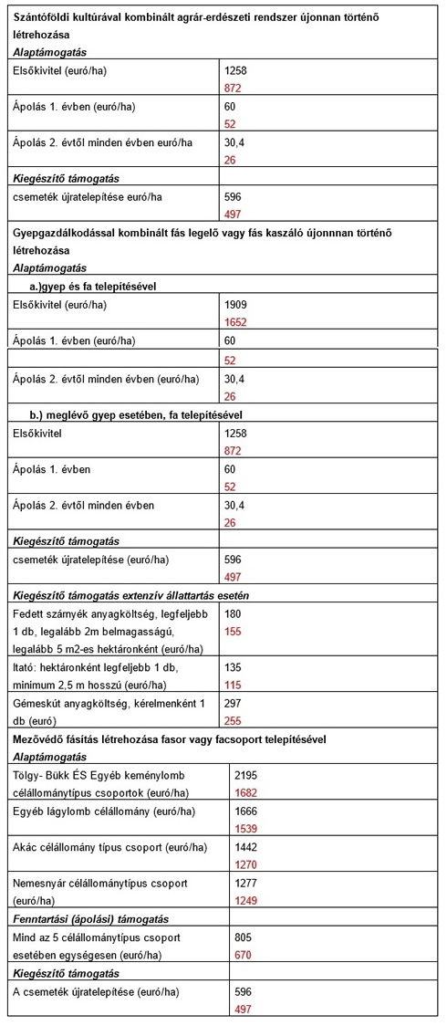 - Az 5.3 A támogatás mértéke, összege fejezetben megemelkedtek a felhívás keretében támogatott tevékenységek egységköltségei. A következő táblázatban (melyet a NAK kollégái állítottak össze) bordóval a módosítás előtti és feketével a megemelt összegek szerepelnek: