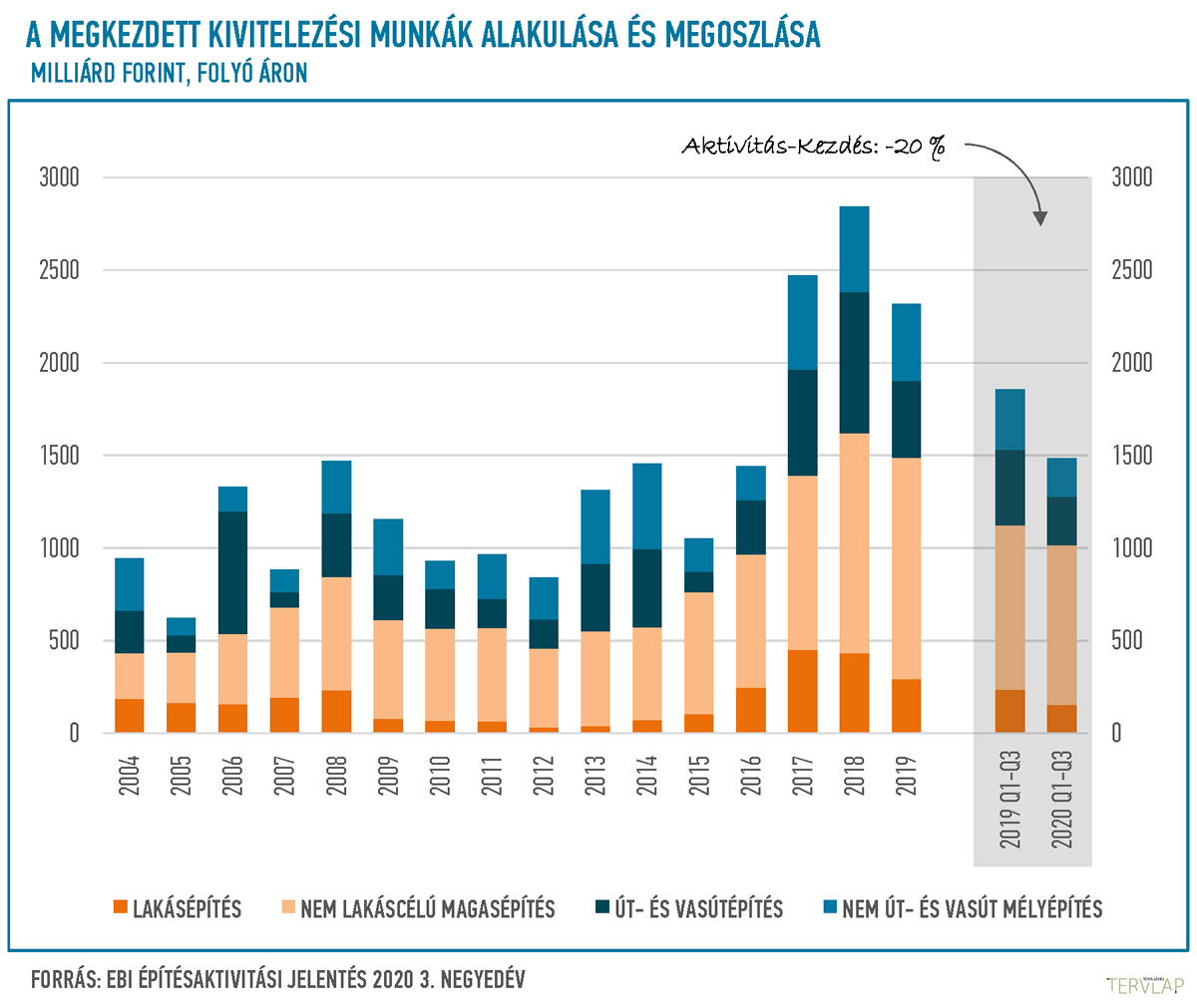 A csökkenés mértéke a lakáscélú magasépítések esetében volt számottevőbb, az idén január és szeptember között 35%-kal kisebb összegben kezdődtek meg kivitelezési munkák a szektorban az előző év azonos időszakához képest. A nem-lakáscélú magasépítések esetében a különbség mindössze 3%-os volt, ami azonban elsősorban az első negyedév magas számainak volt köszönhető, az elmúlt három éves összehasonlításban alacsony második negyedéves Aktivitás-Kezdés mutatót ugyanis még gyengébb harmadik negyedéves követte. Bár ebben az időszakban is indultak nagyobb projektek a szektorban, 2020 harmadik negyedévében vette kezdetét például a nem-lakáscélú magasépítési projektek között például a Testnevelési Egyetem sportcsarnok és mélygarázs beruházásának második A üteme (Csörsz tömb), a debreceni Csokonai Nemzeti Színház felújítása és a Latinovits Színház beruházás, a BalaLand FamilyPark III. üteme, illetve az Allee bevásárlóközpont megújulása.