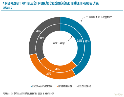 2020 első 9 hónapjában a kivitelezési munkák 42%-a Közép-Magyarországon indult el, 30%-a pedig Nyugat-Magyarországon, így mind a két területen az előző évek átlagához képest nagyobb arányban kezdődtek meg építkezések. Csak a harmadik negyedévet vizsgálva Nyugat-Magyarország részesedése kiugró, 45%-kal, ami több nagyobb projekt elindulásának köszönhető, mint például a 83-as főút beruházásé.