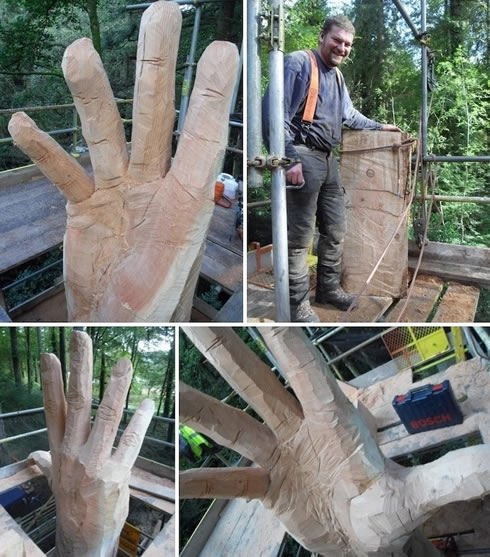 Egy ilyen lenyűgöző darab elkészítése megfelelő szerszámokat igényel. Először is ki kellett támasztani a fát, ami meglehetősen bonyolult művelet volt, 2 napot vett igénybe az állvány felállítása. 6 napi megfeszített munkát követte a láncfűrész és őrlő használata. A fa nem volt elég széles az egész kéz kifaragásához, ezért két részt ki kellett pótolni a hüvelyk- és a kisujjnál. Végül egy természetes, növényi alapú olajjal vonta be a szobrász az elkészült művet.