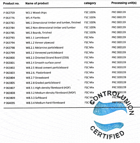 Az eddigi FSC minősített saját termelt faforgács, hengeres vagy fűrészelt, igény esetén gyalult fatermékek, mellett kibővített FSC tanúsítványa szerint már minősített lap-lemez termékekkel is ellátja partnereit.