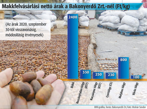 - Minimum 95 százalék csíraképességű és 95 százalék tisztaságú (csak azonos fafajú), érett makkot vásárolunk fel. A minőségi előírást el nem érő makk esetén árcsökkentést alkalmazunk vagy megtagadjuk az átvételt. A minőség megállapítására az átvétel során a helyi erdész kolléga közreműködésével, a gyűjtő jelenlétében kerül sor szemrevételezéssel és metszéspróbával - mondja az osztályvezető, hozzátéve, hogy országos hiány van a kocsányos tölgy makkjából. A Bakonyban a kocsánytalan tölgy makkjából gyenge termés volt, csertölgy- makkból pedig közepes termést tapasztaltak. Patocskai Zoltán rámutat arra is, hogy a makkgyűjtést általában azok végzik, akik megélhetésüket erdei haszonvételekből is kiegészítik. Ennek régiónként kialakult szokásai vannak, sok a visszatérő makkgyűjtő. Egy mázsa makk 23-33 ezer forint is lehet, egy ügyes gyűjtő napi 40-60 kilogrammot képes összeszedni közepes makktermés esetén is, ami jó keresetkiegészítés lehet.