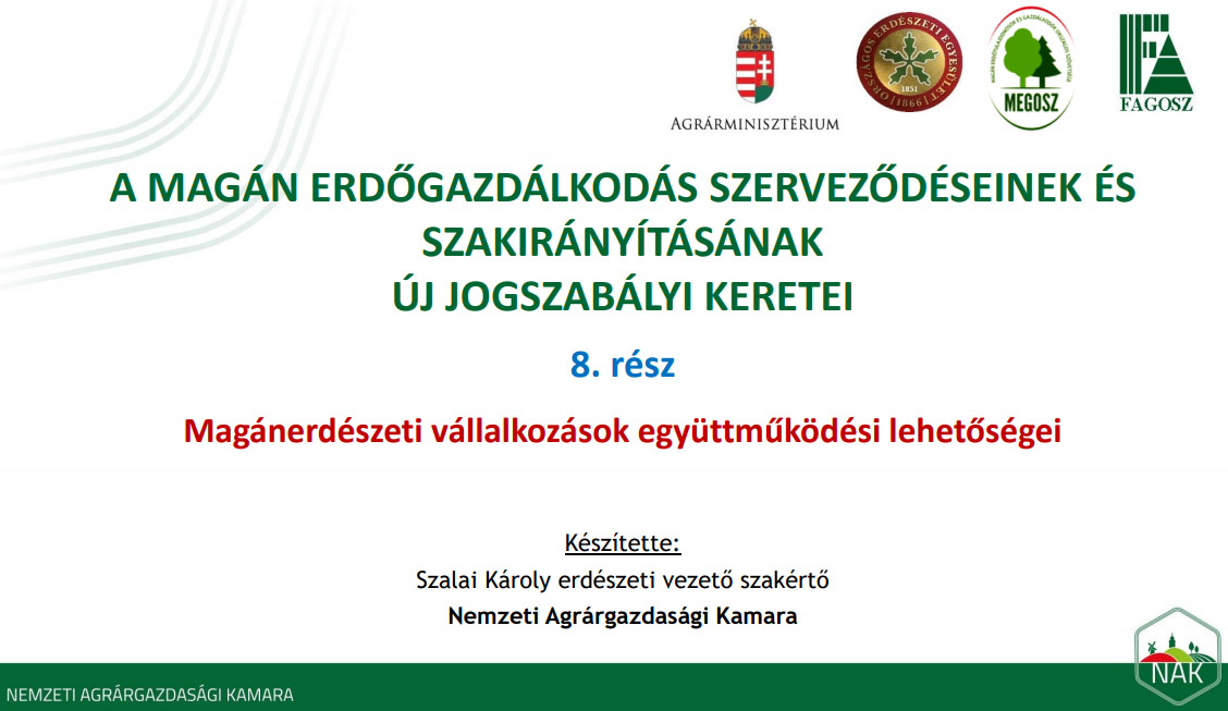 Egy harmadik aspektusból is érdemes megvizsgálni az együttműködések lehetőségét. A korábban ismertetett jogszabályi változások eredményeként a magánerdők jelentős részén várhatóan új erdőgazdálkodó kezdi majd meg a tevékenységét. Az még nehezen kiszámítható, hogy a folyamat inkább az önálló vagy társult tulajdonosi erdőgazdálkodás, vagy inkább a használati jogon alapuló erdőgazdálkodás irányába tolódik el, azonban valószínűleg mindkét megoldásra jelentős igény lesz.