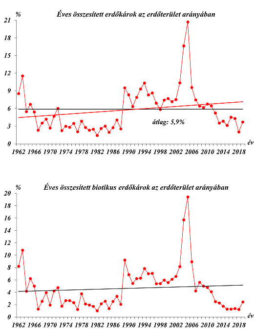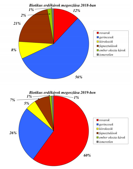 Rovarok okozta károk: Az észak-amerikai származású tölgy-csipkéspoloskát Európában először 2000-ben, Észak-Olaszországban észlelték. Hazánkban 2013-ban, a Szarvasi Arborétumban azonosították. Az azóta eltelt hat évben gyorsan terjeszkedett. 2019 őszére már Magyarország összes megyéjéből előkerült, több megyében már nagyterületű, állományszintű tömeges fellépését is észleltük. 2019 szeptemberében az erdőgazdálkodók körében végzett felmérés alapján Magyarországon mintegy 114 ezer hektárnyi tölgyerdő már fertőzött, amiből 82 ezer ha erős mértékű. Az OENyR-be küldött káradatok jelentési metodikája más, jóval részletesebb adatszolgáltatást vár el, mint az egyszeri országos felmérés egyszerűbb felvételi metodikája. Ebből adódik többek között, hogy a két országos adat jelentősen eltér egymástól: 2019-ben az OENyR-be 26497 ha-ról jelezték kárait a tölgy-csipkéspoloskának. Az eltérő adatok ellenére egyértelműen megállapítható, hogy a tölgy-csipkéspoloska az utóbbi évtized legjelentősebb hatású rovarkártevője lehet. A faj tömeges fellépésének hosszú távú hatásaira vonatkozóan egyelőre még csak előzetes eredmények vannak. Ezek azonban arra utalnak, hogy a megtámadott fák növekedésére, egészségi állapotára és makktermésére, valamint a tölgyekhez kötődő fajgazdag életközösségekre nézve is jelentős negatív hatás várható. Egyelőre nem ismert hatékony, környezeti szempontból is tolerálható, nagy területen alkalmazható védekezési eljárás a faj ellen. Valószínű, hogy hosszabb távú megoldást csak egy sikeres klasszikus biológiai védekezési program jelenthet. A szúk (az összes jelenthető szúfaj ide értendő) kártételével érintett terület 488 ha volt, melynek 95%-án a károkat a betűzőszú (464 ha-on) okozta. Kártételét legnagyobb területről a Központi-Bükkből jelezték. A károk 99%-a-a teljes kár volt, azaz a faegyedek pusztulását okozta. Magyarországon az utóbbi évtizedekben ez a faj a lucosok területének csökkenésében meghatározó szerepet játszott. A cserebogár pajorok kárait több mint 400 ha-ról jelezték (406 ha), legnagyobb kiterjedéssel ebben az évben is a Belső-Somogyi-homokvidékről. A károk 39%-a teljes kár volt. A májusi cserebogár, valamint az erdei cserebogár imágóinak rágáskárait 2019-ben 203 ha-ról jelentették. Az erdészeti fénycsapdák 2019-ben az előző évhez képest több májusi cserebogarat fogtak, összesen 3158 példányt, ami az előző évi fogásszám több mint kétszerese. A májusi cserebogarat legnagyobb példányszámban a barcsi csapda fogta. 2020- ban a Melolontha melolontha VI. törzsének rajzása várható. A gyapjaslepke 2003-2006-os tömegszaporodását követően a 2012-2015 között várt újabb nagy területű tömegszaporodás elmaradt, bár ezekben az években is növekedtek a rágáskárok, de korántsem olyan mértékben, mint az előző gradáció alatt. A legnagyobb károk 2013-ban keletkeztek, akkor közel 13000 ha-ról jelezték a faj okozta károkat. Ezt követően fokozatosan csökkent a jelentett kár nagysága. A bejelentett gyapjaslepke rágáskárok az elmúlt 3 évben sem voltak jelentősek: 2017-ben mintegy 80 ha, 2018-ban 230 ha, 2019-ben 370 ha volt összesen Magyarországon. 2019-ben a károk több mint 40%-a (42 %) enyhe fokozatú volt. 2016-ban és 2017-ben egyetlen hektárról sem érkezett jelentés petecsomó fertőzöttségről. 2018-ban ismét jelentettek, összesen 151 ha-ról. 2019-ben kis mértékben növekedett a bejelentett fertőzöttség (192 ha), de csak egy tájegységről jelezték előfordulását. Az utóbbi években az Erdészeti Fénycsapda Hálózat összes csapdája alacsony egyedszámban fogta, ill. egyáltalán nem fogta a gyapjaslepke hímeket. 2018-ban néhány csapdában megemelkedtek a fogásszámok, bár ezek sem voltak túl magasak. 2019-ben a legnagyobb fogásszám sem érte el egy-egy csapda esetében a 100 példányt, sőt az 50-et is 15 csak két csapda érte el (Szentendre és Diósjenő). Tömegszaporodás esetén akár több ezer példányt is fog egy-egy csapda. 2013-ban egy új, a gyapjaslepke népességére hatást gyakorló tényező jelent meg Magyarország erdeiben: egy entomopatogén gomba - az Entomophaga maimaiga. Jelentősége, szerepe az elmúlt évek rágáskárainak mérséklésében és fénycsapda fogásszámainak csökkentésében nagy valószínűséggel meghatározó volt. A fénycsapda fogási adatok és a jelentett gyapjaslepke petecsomó adatok alapján elmondható, hogy jelentős gyapjaslepke tömegszaporodásra 2020-ban sem kell számítani, bár egyes területeken kialakulhatnak kisebb területű rágáskárok. Az Entomophaga maimaiga hatására a korábbi domináns lombfogyasztó, a gyapjaslepke jelentősége (kárterület nagysága, a jelentősebb tömegszaporodások gyakorisága) valószínűleg csökkenni fog. A helyét vélhetően más fajok (araszolók, sodrómolyok) veszik át.