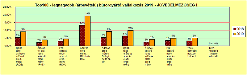 Üzemi eredmény nagyságrendje Az összesített számadatok szerint 2007-ben a legnagyobb 100 cég együttesen 4.708 millió forintnyi üzemi eredményt ért el; 2008-ban 4.988 millió forintot, ugyanez a szám 2009-ben 4.246 millió forint, 2010-ben 4.223 millió forint, 2011-ben 4.254 millió forint, 2012-ben 2.415 millió forint, 2013-ban 4.863 millió forint. 2014-ben 3.605 millió Ft, 2015-ben 4,788 millió forint, 2016-ban 3,669 millió forint, 2017-ean 5,897 millió forint, 2018-ban 5,182 millió forint, míg 2019-ben 8,929 millió forint összeget tett ki. Ez az üzemi eredmény 72,3%-os növekedését jelenti az előző évhez képest.