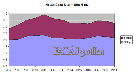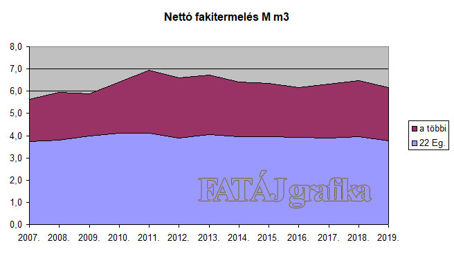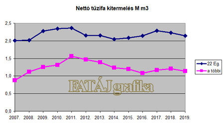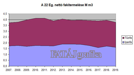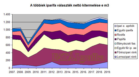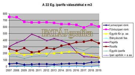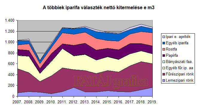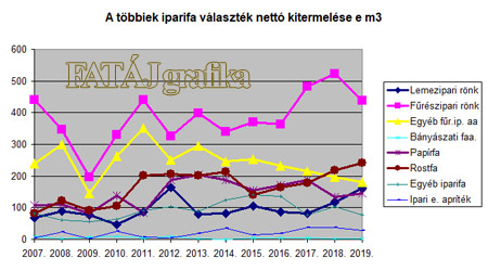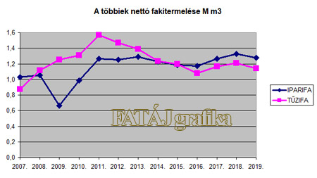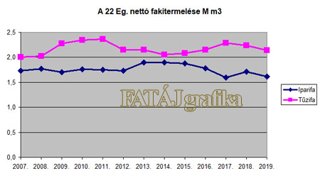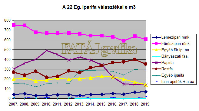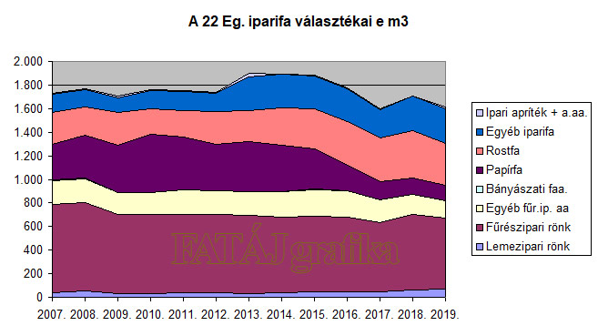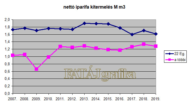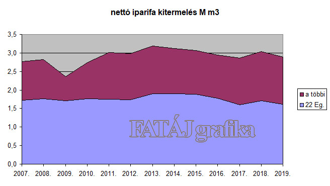 Iparifában is az állami 22 teljesítménye az egyenletesebb, ugyanakkor az időszak végén e köt teljesítménye csökkenő, míg a magánosoké növekvő. Persze a két kör fafajösszetétele jelentősen eltér, a magánosoknál sok az akác és a nyár (nemesnyár), míg a 22 cégnél ehhez képest a keménylombos aránya a magasabb.