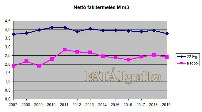 Az említett erdészeti oldalon található a Nettó fakitermelés állami erdőgazdaságok_idősor_2007_2019 is, mely a 22 állami erdőgazdaság összesített adatait tartalmazza. Hasonló nevű másik fájl is letölthető ugyanezen évekre az erdőgazdaságokon kívüli erdőgazdálkodókra, így azt hihetnénk, hogy e kettő összege egyenlő a teljes Nettó fakitermelés idősor megfelelő évi adataival, de ez sajnos nem igaz. Az erdőgazdaságokon kívüli erdőgazdálkodók fájlban az egyes évek sarokszámai ugyanis csak mintegy 0,5 millió m3-t, vagy annál kevesebbet mutatnak. A 22 erdőgazdaságon kívüli többiek (egyéb államiak, közösségiek és magán) teljesítménye pedig ennél sokkal több, nagyjából 2 és 3 millió m3 közötti az évek során. A "kívüliek" fájljában feltehetően e nagyon sok szereplős körből erre kiválasztott, rendszeres és korrekt válaszadásra hajlandó és alkalmas vállalkozások adatösszesítése szerepel. Ez pedig az NFK munkatársai által becslés útján (a módszertant nem részletezem, utána lehet nézni) megállapított "kívüliek" összteljesítményének csak negyede-hatoda. A "kívüliek" xlsx fájlja tehát nagyon fontos, mert az az egyik alapja a becslési munkának, amivel e kör teljes teljesítménye meghatározható, ugyanakkor a jelen elemzéshez nem lehet felhasználni. Ezért kivontam a nettó fakitermelés (fafaj és választék) összesen adataiból a nettó fakitermelés állami erdőgazdaságok adatait, hogy megkapjam, mennyi lehet a többiek (egyéb államiak + közösségiek + magán) teljesítménye. Tehát: "nettó összes" - "22 Eg." = "a többi" Az "a többi" csoport tehát nem egészen homogén, de teljesítményük döntő többségét a magán erdőgazdálkodók adják.