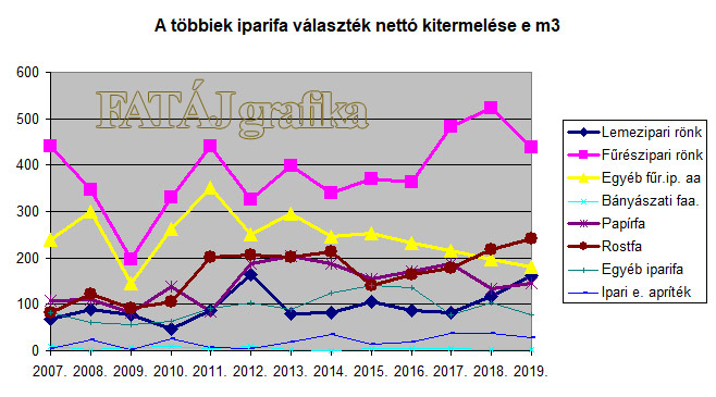 A többiek főleg magán erdőgazdálkodókból álló körében a fűrészrönk és az egyéb fűrészipari alapanyag választékoknál a 2008. évi válságnak igen durva hatása volt, amit viszonylag gyors felépülés követett. Az egyéb fűrészipari alapanyag termelése ezt követően azonban folyamatosan csökkent, míg a fűrészrönknél - ha ugrásokkal is -, lényegében emelkedés következett. A papírfa és rostfa esetében nem volt olyan határozott váltás, mint az állami 22-nél, igaz, az utolsó két évben e szegmensben is jobban nőtt a rostfa, mint a papírfa. Forrás: Az említett kormányzati oldalról letölthetőek