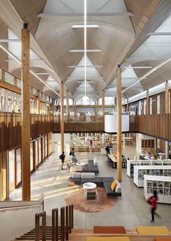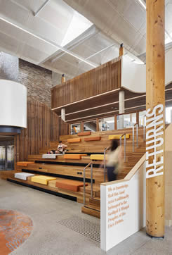 A fa felhasználása barátságos, meleg és otthonos teret hoz létre, létrehozva egy olyan épületet, amelyet a közösség nagy örömmel használ.