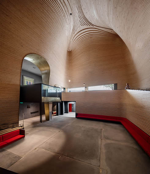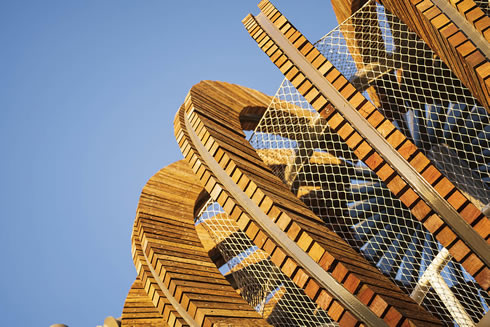 A többszintes épület kívül-belül fából készült, az oszlopai, a homlokzata, az árnyékolk, a belső falak, az ablak- és ajtókeretei mind-mind fából készültek. Sőt: a székek, a beépített bútorok és a mennyezetek is fa.
