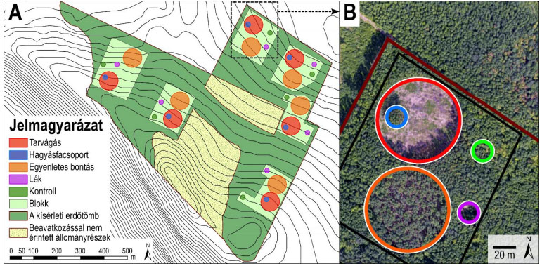 1) Pilis Üzemmód kísérlet A Pilis Üzemmód kísérlet egy 40 hektáros, 80 éves gyertyános-tölgyes állományban zajlik. Négyféle erdészeti kezelés hatásait vizsgáljuk, kezeletlen kontroll állományrészekhez viszonyítva: vágásterület, hagyásfacsoport, egyenletes bontás (vágásos üzemmód elemei), valamint lékvágás (örökerdő üzemmód beavatkozása). A kezelések hat ismétlésben, teljes blokk elrendezésben valósulnak meg, így összesen 30 mintaterületen történik mintavétel. 2014-ben, a még érintetlen állományban rögzítettük a kiindulási állapotokat. A fahasználatokra 2014-2015 telén került sor, azóta a vizsgálatok éves rendszerességgel, változatlan módszertannal zajlanak