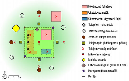 A terepi adatgyűjtés minden mintaterületen egy hatszor hat méteres elkerített terület körül zajlanak, a terület közepén történik a mikroklíma változók mérése. Az aljnövényzet és az újulat természetes fejlődését a vad elől elkerített és kerítetlen mintanégyzetekben is nyomon követjük, így a vadállomány hatását külön is vizsgálni tudjuk. Egyedileg mérjük természetes és beültetett facsemeték, valamint két lágyszárú faj (odvas keltike és hagymás fogasír) beültetett egyedeinek növekedését. Kihelyezett telepeken vizsgáltuk két mohafaj, egy specialista korhadéklakó és egy általánosan elterjedt, generalista faj növekedését is a különböző kezelésekben. A futóbogarakat és a pókokat talajcsapdák segítségével, a legyeket ún. Malaise-csapdákkal, a televényférgeket talajmintavétellel gyűjtjük. A biodiverzitás változásai mellett erdei ökoszisztéma funkciókat is nyomon követünk, mint a lebontás és a hernyó-predáció. A lebontást avar- és faanyag minták tömegváltozása alapján, a hernyópredációt műhernyók kihelyezésével vizsgáljuk.