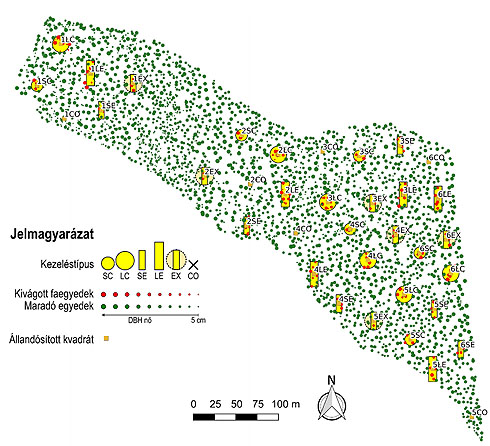 A kezelések teljes blokk elrendezésben, hat ismétlésben valósulnak meg, így összesen 36 mintaterületen dolgozunk. 2018-ban történt meg az alapállapot felmérése, a lékek kialakítására 2019 februárjában került sor. A kezelést követő adatgyűjtés a 2019-es évvel kezdődően évente fog zajlani. A Pilis Üzemmód kísérlethez hasonlóan folyamatosan nyomon követjük a mikroklíma- és talajviszonyokat, illetve a különböző állat- és növénycsoportok változásait. A lékek kialakítása előtt a kísérlet egész területén megtörtént a faállomány teljes körű feltérképezése (4. ábra), így lehetőség nyílik a faállomány változásainak (pl. a fatömeg alakulásának, a lékek peremén található fák egyedi fejlődésének), illetve a lékek betöltődésének nyomon követésére is. A Pilis Lék kísérlet esetében a teljes állományt bekerítjük, így vizsgálataink itt a vad kizárása mellett fognak zajlani.