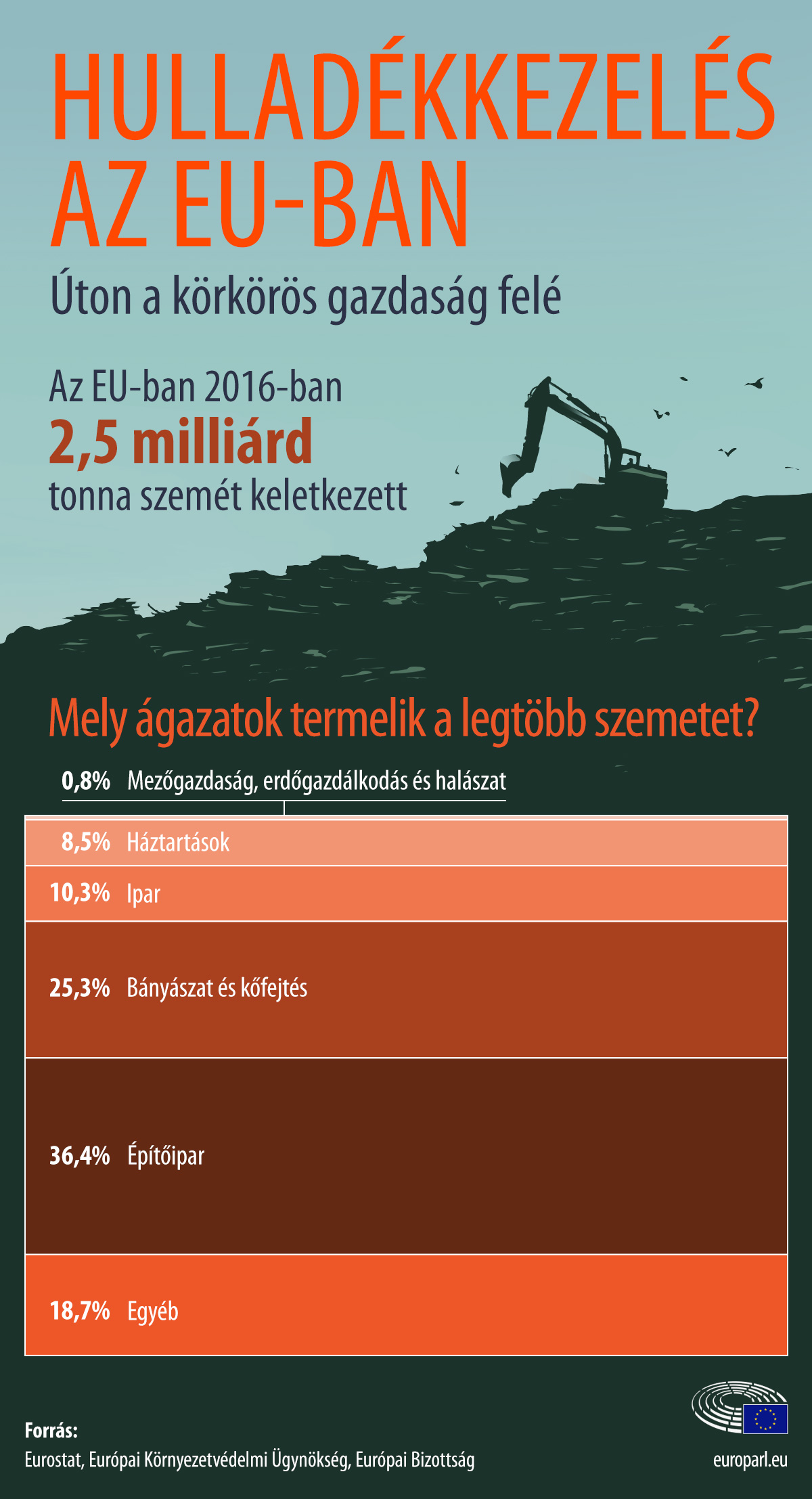 A kommunális hulladék tizedét teszi ki annak a 2,5 milliárd tonna hulladéknak, ami évente keletkezik az EU-ban. Az EP sürgeti a tagállamokat, hogy fokozzák az újrahasznosítás mértékét, csökkentsék a hulladéklerakók használatát és minimalizálják a hulladékok égetését.