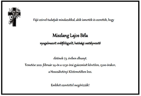 Miszlang Bálint: Édesapámtól a hosszúhetényi köztemetőben veszük végső búcsút, február 24-én 13:00 órakor, a 12:30 órai gyászmisét követően.