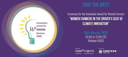 A pályázat (verseny) neve angolul: Innovation Award for Women Farmers 2021. Március 10-én a Copa-Cogeca megtartotta a női mezőgazdasági termelők számára nyújtott innovációs díj 6. kiadásának ünnepségét - a Corteva Agriscience támogatásával. Az idei díj révén azt kívánták bemutatni, hogy a női gazdálkodók hogyan segítik elő az új üzleti modellek kialakulását és aktív szerepüket a mezőgazdaság és az erdészet terén az éghajlatváltozás elleni küzdelemben. Az ünnepségnek Evelyn Regner (S&D, AT) és Carmen Avram (S&D, RO) európai parlamenti képviselő volt a házigazdája, s ők mondták a nyitóbeszédet. Helena Dalli biztos videohívást küldött az összes női mezőgazdasági termelőnek és az esemény résztvevőinek, majd Molnár Katalin asszony - aki Wojciechowski biztos kabinetfőnök helyettese - tartott beszédet. A nyertest és a különdíjat Maria Angeles Benitez Salas asszony, a Mezőgazdasági és Vidékfejlesztési Főigazgatóság főigazgató-helyettese és Peter Schmidt, az Európai Gazdasági és Szociális Bizottság Mezőgazdasági, Vidékfejlesztési és Környezetvédelmi Szakosztályának elnöke hirdette ki.