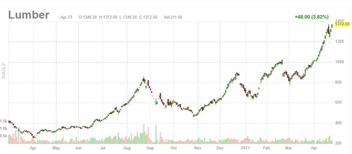 A járvány utáni fellendülésről egy képben. Az új építésű házak iránti nagy amerikai kereslet, illetve a készletek szűkösségének együttese az égbe lőtte ki az építési faanyag (lumber) árát.