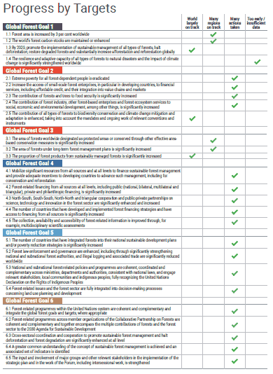 1.) Meg kell fordítani az erdőtakaró csökkenését világszerte a fenntartható erdőgazdálkodás révén, beleértve a védelmet, helyreállítást, az erdősítést és az újratelepítést, és fokozni kell az erdőpusztulás megelőzésére irányuló erőfeszítéseket, és hozzá kell járulni az éghajlatváltozás kezelésére irányuló globális erőfeszítésekhez. (Ennek 4 altémája van.)