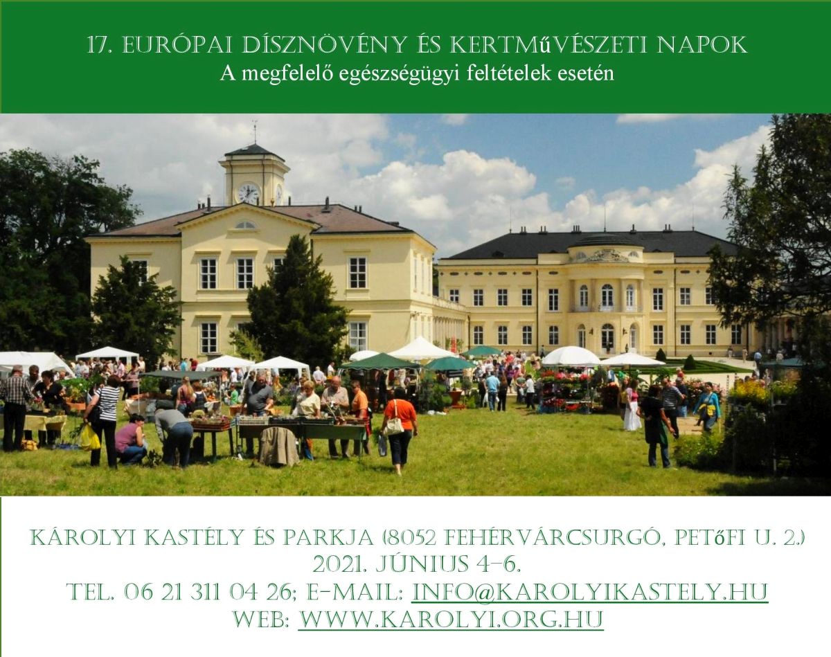 Június 4-6. között között a fehérvárcsurgói Károlyi Kastély parkjában a Károlyi József Alapítvány 17. alkalommal rendezi meg az Európai Dísznövény és Kertművészeti Napokat. Az idei rendezvény kiemelt témája a víz és erdőgazdálkodás ismereteinek átadása lesz. |