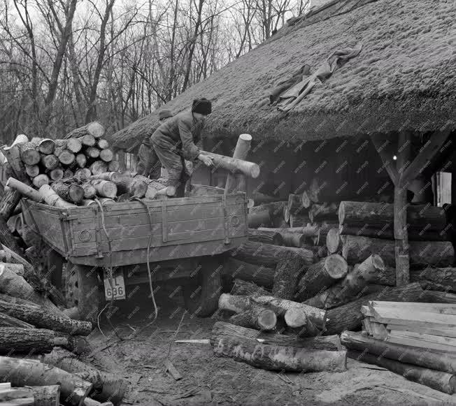Mezőgazdaság - Bugaci erdészet Magyarország, Bács-Kiskun, Bugac Bugac, 1959. március 12. A csemetekertek munkásai rakodják a farönköket a teherautóról a Kiskunsági Erdőgazdaság Bugaci Erdészetének fafeldolgozó telepén. Az erdőgazdaságban 60 millió fenyőcsemetét nevelnek. MTI Fotó: Urbán Nándor