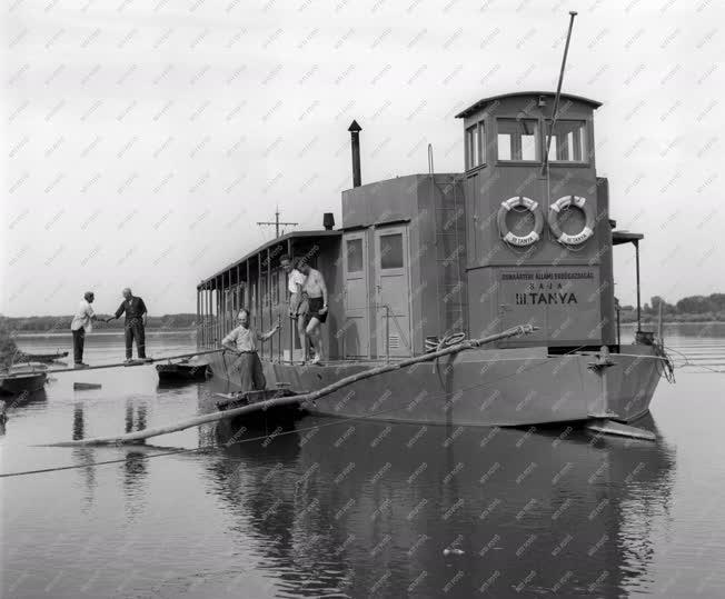 Gazdaság - Erdőgazdaság a Duna árterületén Magyarország, Bács-Kiskun, Baja Baja, 1957. június 14. Dunaártéri (más néven Bajai) Erdőgazdaság 3. számú tanyahajója a Duna árterén. Az ilyen területeken elhelyezkedő erdőgazdaságok erdészeinek és erdőmunkásainak vízi jártassági vizsgát kell tenniök, a csónak és a hajó kezeléséhez is kell érteniök. Életüket vízen járó tanyahajókon töltik. MTI Fotó: Bereth Ferenc Eztán a kép további azonosítói, adatai következnek, s meg is rendelhető.