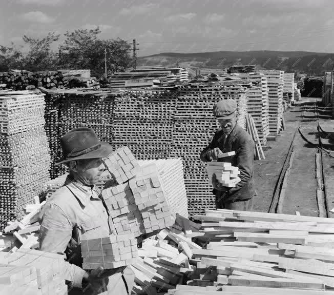 Ipar - Recski Fagyártmányüzem Magyarország, Heves megye, Recsk Recsk, 1962. szeptember 21. A hulladékfából készült parkettákat válogatják a dolgozók a Mátrai Erdőgazdaság recski Fagyártmány-üzemében. A kétmillió forintos költséggel korszerűsített üzemben többek között bányafadonga, parketta és bútorléc készül. MTI Fotó: Birgés Árpád