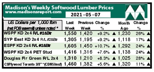 Észak-amerikai fűrészáru árak május elején [kereskedés alapegysége 1000 board feet-nek megfelelő faanyag (1000 fbm = kb. 2,359 köbméter)]