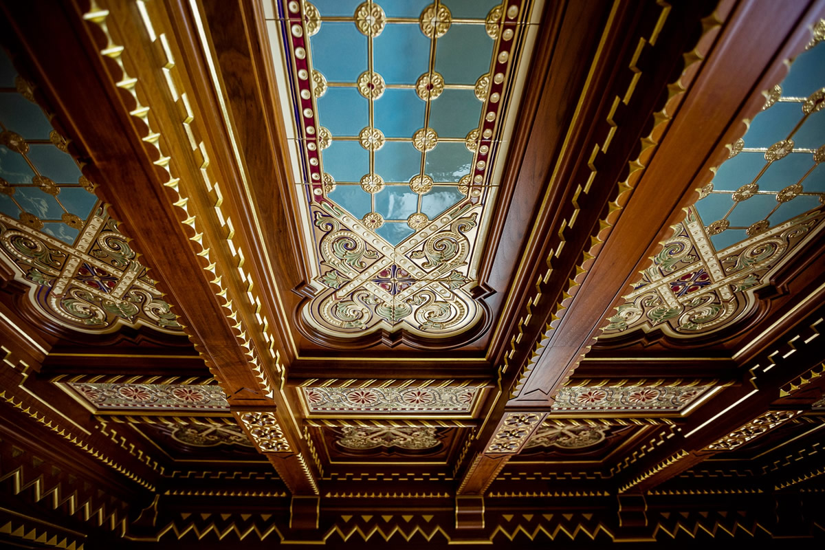 A mennyezet, az oldalfal és a bútorzat egyaránt a dualizmus idején művészi famunkáival hírnevet szerzett Thék Endre műhelyéből került ki. A terem mennyezete gerendás, faragott díszítésű, kazettás részekből áll, a faanyag első osztályú, csomómentes, előgőzölt kerti dió, felületi díszítésére 24 karátos aranylapokat használtak. A mennyezet igazi különlegességét adják a kazettákba illesztett Zsolnay-pirogránit lapok, amelyek különálló képekként is értelmezhetőek.